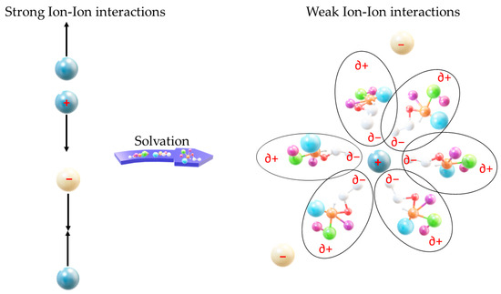 Aluminum trifluoromethane sulfonate (Al (TfO)3) has been tested as a replacement for A l C l 3 , which has been associated with safety concerns due to its sensitivity to air and moisture [94]. However, the binary composition of urea/N-methyl-acetamide (NMA) has poor conductivity around 10−6 mS·cm−1. The addition of Al(TfO)3, on the other hand, improved conductivity with values reaching as high as 2.5 mS·cm−1 [94]. The effect of solvents on the ionic conductivity of the system has been investigated, with a focus on the relationship between the dielectric constant and ionic conductivity. Mandai et al. observed that solvents with high dielectric constants effectively weaken the strong electric field generated by charged species, leading to a reduction in ion–ion interactions and the dissociation of salts into their constituent ions [94]. This is because when a salt is dissolved in a solvent, the ions in the salt become surrounded by solvent molecules, which interact with the ions through electrostatic forces [95]. Solvents with high dielectric constants can weaken the electrostatic forces between ions by polarizing the solvent molecules, leading to the development of partial positive and negative charges on the ends of the molecules [96]. These partial charges on the solvent molecules can interact with ions, therefore leading to a reduction in the electrostatic forces between the ions, as illustrated in Figure 11 [94,95,96]. Hence, solvents with high dielectric constants are more effective at dissociating salts into their constituent ions.