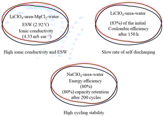 The electrochemical stability windows of the LiClO4-urea-MgCl2-water electrolyte reach 2.92 V, as highlighted in Figure 12. In addition, there is a positive correlation between the urea ratio and the ionic conductivity. Further, the increase in H2O from 4 to 6 wt.% results in a rise in ionic conductivity from 0.97 to 4.33 mS·cm−1 but a decrease in ESW from 3.29 to 2.72 V [98]. Therefore, the water content is significant for the properties of the electrolyte. Moreover, an electrolyte of LiClO4-urea-water was incorporated in a cell containing Li4Ti5O12 and LiMn2O4 with a mass ratio of 0.7:1 and an Al current collector. This cell exhibited a discharge voltage plateau at 2.2V and approximately 125 mA·h·g−1 and 104 mA·h·g−1, respectively, in the initial charging/discharging cycle [99]. Additionally, the initial Coulombic efficiency was around 83%. The discharging capacity demonstrated a value of about 148 mA·h·g−1 and excellent cycling stability, displaying a capacity decay rate per cycle of 0.011% at 10 C for 1000 cycles. After resting at an open circuit for 150 h following a full charge, the battery maintains about 86% of its initial capacity, demonstrating a slow rate of self-discharge [99]. Hou et al. used LiClO4-H2O-urea electrolytes with LiMn2O4 and Mo6S8 electrodes. They showed that the battery maintains a high capacity of 75% after 500 charging and discharging cycles at 0.1 C, with an average Coulombic efficiency of 99.5% [53]. The system can store a high amount of energy, even when charged and discharged quickly. At a rate of 0.1 C, it can store 45 mA·h·g−1 and at a rate of 30 C, it can store 28 mA·h·g−1. This result implies that the battery is suitable for tasks demanding a combination of high power and high energy. Moreover, the battery can maintain its high performance over a long time. After 2000 cycles at a high rate of 10 C, it can still store 86% of its original energy [53]. This is due to the high ionic conductivity and small interfacial activation energy of the aqueous electrolyte [53]. In addition, capacity was maintained after 100 cycles with an average Coulombic efficiency of 98.9% at 0.5 C. Even at a rate of 20 C charged with LiClO4-H2O-urea, the cell retains a discharge capacity of 20 mA·h·g−1 (based on the combined mass of anode and cathode active materials). Furthermore, after 500 cycles at 10 C, the battery retains 85% of its capacity [53]. They also reported that usage of NaClO4-H2O-urea allows the utilization of a high-potential symmetrical sodium-ion battery using Na3V2(PO4)3 as both the cathode and anode materials. The usage of a NaClO4-urea DES exhibits an energy efficiency of 80%. Further, at a rate of 0.1 C, the cell demonstrates a stable voltage plateau at 1.7 V, delivering a discharge capacity of 37 mA·h·g−1. In addition, high cycling stability is observed with around 80% capacity retention over 200 cycles. Furthermore, the battery demonstrated substantial capacities at varying rates: 37, 32, 30, 25, 21, and 18 mA·h·g−1 at 0.1, 0.5, 1, 5, 10, and 20 C, respectively. Even at 5 C, it retains 72% of its initial capacity after 1000 cycles, maintaining a high CE close to 100% [53]. These results suggest that the formation of a stable SEI layer through urea coordination with Na+ is significant for achieving consistent and stable cycling performance [53].