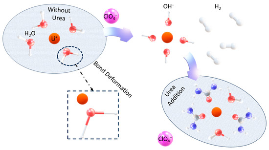 Figure 13. When the concentration of the electrolyte in water increases, the electrolyte pH values become lower, creating a more acidic environment. This acid environment favors the HER process, which produces H2 gas. A charge transfer occurs between Li-OH2 leading to a weakening O-H bond in water. Therefore, protonation occurs and, in the end, H2 is released. With the addition of urea to the electrolyte, the pH values can be increased, resulting in more neutral solutions that inhibit the HER. This means that urea can reduce water splitting and the release of H2 gas, which can lower the efficiency and safety of the battery. Therefore, urea can enhance the stability window of the electrolyte, allowing it to operate at higher voltages without damaging the battery.