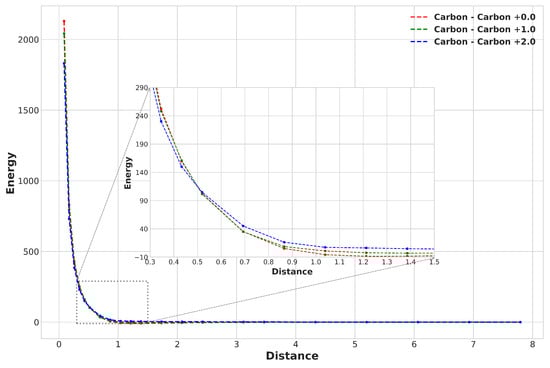 For the system charge configuration of carbon–carbon, for instance, the plot of relative non-bonded energy versus distance is shown in Figure 1 for various partial charges. In order to learn the interatomic potential for each configuration, the Buckingham potential was selected as the appropriate measure: