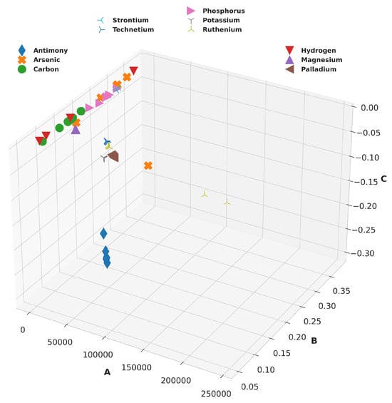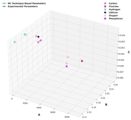 A 3D plot of the Buckingham potential parameter values for different elements and partial charges from Table 4, obtained experimentally and using our trained ML model.