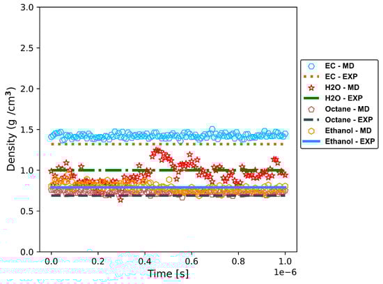 Density as a function of time. Comparison of density values of EC, H2O, octane and ethanol molecules obtained from MD simulations using the non-bonded potential parameters from the trained ML model with the corresponding experimental data.