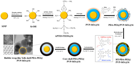 Reagents employed in this study were of analytical grade. They were used as obtained without further purification. Sulfuric acid (H2SO4, 98.0%), hydrogen peroxide (H2O2, 30.0%), and PVP K30 were obtained from Daejung Chemical & Metals (Siheung, Republic of Korea). Si nanoparticles (powder, APS ≤ 50 nm, 98.0%) were purchased from Alfa Aesar (Haverhill, MA, USA). TEOS (≥99.0%), dopamine hydrochloride for PDA coating (C8H12ClNO2), and PEI solution (MW~750,000; 50 wt.% in H2O) were purchased from Sigma-Aldrich (St. Louis, MO, USA). APTES (≥99.0%) was purchased from AcroSealTM, Thermo Scientific Chemicals (Loughborough, UK). EtOH (C2H5OH, 94.5%) was purchased from Samchun Pure Chemical Co., Ltd. (Seoul, Republic of Korea). NaOH was supplied by Duksan Pure Chemicals (Ansan, Republic of Korea). High-purity industrial argon (Ar, 99.0%) gas used for pyrolysis was supplied by PSG Corp, Busan, Republic of Korea. All aqueous solutions were prepared and washed with deionized (DI) water.