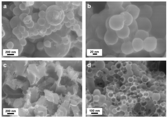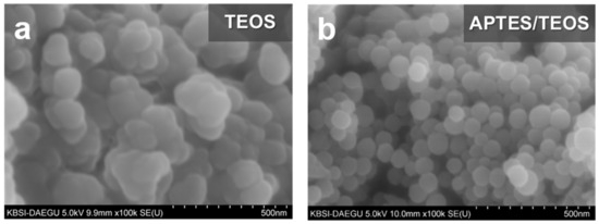 SEM images of TEOS- and APTES/TEOS-derived SiO2 shells precursors are shown in Figure 2.