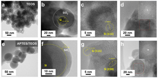 TEM images of (a–d) TEOS-derived SiO2@Si and (e–h) APTES/TEOS-derived SiO2@Si nanoparticles after a catalyst-free, sol-gel synthesis at room temperature. The Si nanoparticles and SiO2 coating are highlighted as yellow and white circles, respectively.