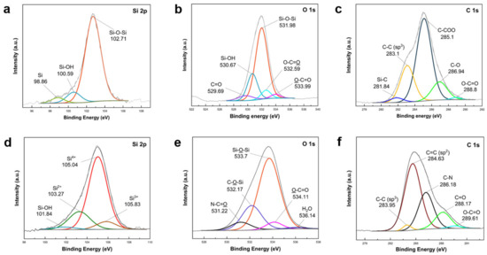 XPS high resolution (a,d) Si 2p, (b,e) O 1s, and (c,f) C 1s scans of (a–c) TEOS–SiO2@Si and (d–f) APTES/TEOS–SiO2@Si samples.