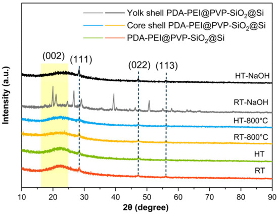 XRD patterns of core shell and yolk shell PDA–PEI@PVP–SiO2@Si composites fabricated from hydrothermally-assisted modified Stöber (HT) compared with the control group for fabricating the conventional sol-gel reaction at room temperature (RT), before and after pyrolysis, and after NaOH etching processes.