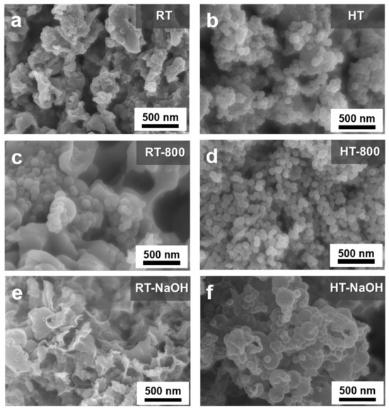 FE-SEM images of (a,c,e) composite samples prepared via RT and (b,d,f) HT before and after pyrolysis and NaOH etching of SiO2 template.