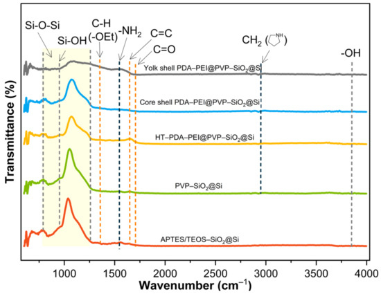 FTIR spectra of APTES/TEOS–SiO2@Si, PVP–SiO2@Si, HT–PDA–PEI@PVP–SiO2@Si, core shell PDA–PEI@PVP–SiO2@Si, and yolk shell PDA–PEI@PVP–SiO2@Si samples with PVP K30-surface protection.