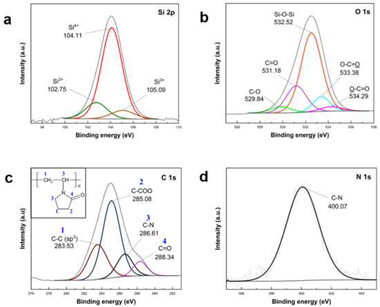 The confirmation of PVP K30 polymer loading into APTES/TEOS–SiO2@Si was established through XPS analysis, as depicted in Figure 9. The survey spectra of PVP–SiO2@Si were compared with pristine Si nanoparticles (Figure S7 in Supplementary Materials). High-resolution Si 2p scans (Figure 9a) exhibited peaks at 104.11 eV, 102.75 eV, and 105.09 eV, corresponding to the Si–O–Si band. Si oxidation states (Si2+, Si3+, Si4+) indicated SiO2 shell synthesis after APTES and TEOS condensation [61,63]. O 1s scans (Figure 9b) revealed peaks at 532.52 eV (Si–O–Si band) and 531.18 eV (C=O in PVP), while 529.84 eV (C–O), 533.38 eV (O–C=O), and 529.84 eV (O–C=O) were attributed to carbon-containing groups of silane precursors [62]. Peaks at 283.53 eV, 285.08 eV, 286.61 eV, and 288.34 eV in the C 1s (Figure 9c) scans indicated PVP molecular structure contributions [68]. The N 1s scan (Figure 9d) at 400.07 eV identified N atoms from C–N in the APTES structure. These XPS results substantiate the successful incorporation of PVP K30 into APTES/TEOS–SiO2@Si.