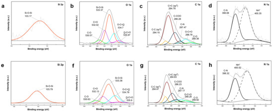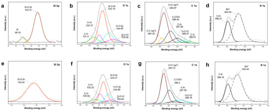 XPS high-resolution (a,e) Si 2p, (b,f) O 1s, (c,g) C 1s, and (d,h) N 1s scans of (a–d) core shell PDA@SiO2@Si and (e–h) yolk shell PDA-PEI@PVP-SiO2@Si composite samples.