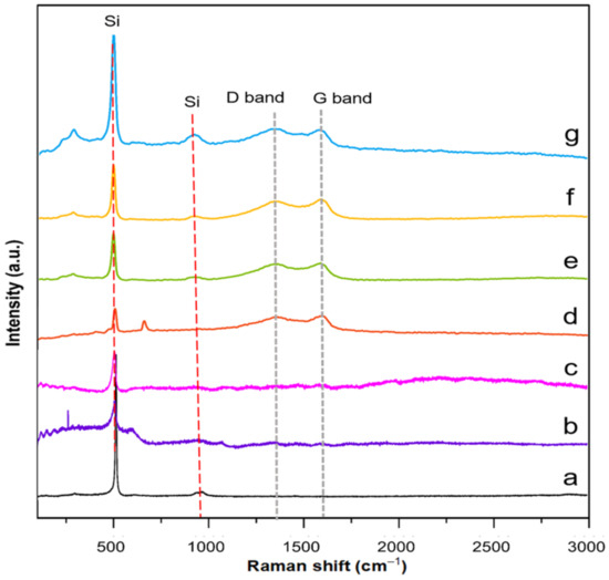 Raman spectra of (a) TEOS–SiO2@Si, (b) APTES/TEOS–SiO2@Si, (c) PVP–SiO2@Si, (d) core shell PDA@SiO2@Si, (e) yolk shell PDA–PEI@SiO2@Si, (f) yolk shell PDA–PEI@PVP–SiO2@Si, and (g) core shell PDA–PEI@SiO2@Si samples.