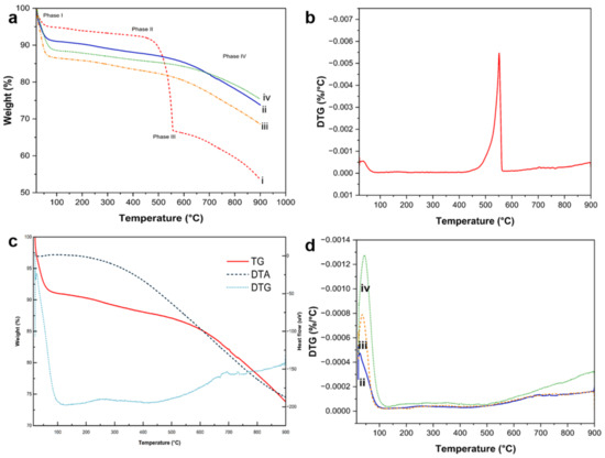 Figure 13 displays TG/DTA thermograms, including DTG curves, of representative composites that were subjected to controlled combustion up to 800 °C under N2 gas protection.