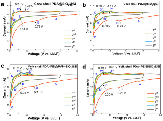 CV profiles of (a) core shell PDA@SiO2@Si in RT, (b) core shell PDA@SiO2@Si in HT, (c) yolk shell PDA–PEI@PVP–SiO2@Si in HT, and (d) yolk shell PDA–PEI@SiO2@Si in HT during the initial five cycles.
