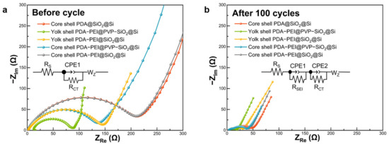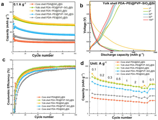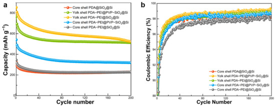 To investigate the impact of a yolk shell structure on electrochemical performance, a composite material was synthesized using the same process but with a core shell configuration. These hybrid composites served as anode materials for LIBs, and their electrochemical performances were assessed under diverse cycling conditions. The representative yolk shell composite material (PDA–PEI@PVP–SiO2@Si) exhibited an initial capacity of 719 mAh g−1, maintaining 539 mAh g−1 after 100 cycles at 0.1 A g−1. Under a higher current density of 5 A g−1, it sustained a capacity of 453 mAh g−1, surpassing the performance of core shell composite counterparts. The notable electrochemical performance of the PDA–PEI@PVP–SiO2@Si composite was attributed to the synergistic effects of the three-pronged fabrication strategy employed in this study.