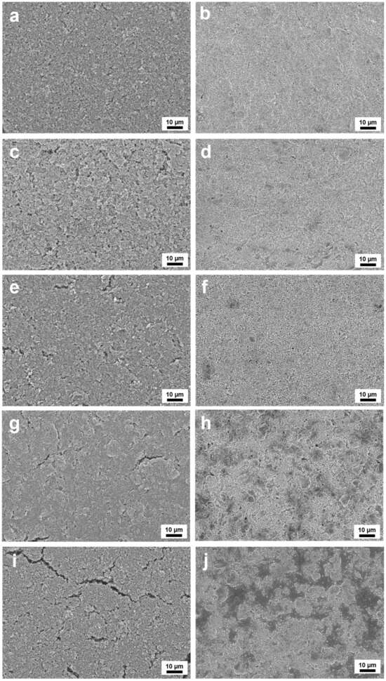 Following 200 cycles at 1 A g−1, a smooth and crack-free surface of the representative composite electrode was found as shown in Figure 19b. Recurring electrochemical reactions resulted in a thin layer covering active materials on the electrode surface. Both yolk shell PDA–PEI@SiO2@Si and core shell PDA–PEI@PVP–SiO2@Si samples displayed a similar surface topology, with pores initially present before cycling being filled with accumulated reaction by-products on the electrode surface (see Figure 19d and Figure 19f, respectively). In contrast, core shell PDA–PEI@SiO2@Si and core shell PDA@SiO2@Si samples exhibited severe surface cracks even before cycling due to the inflexible and unstable nature of their electrode structures. These cracks, filled with aggregated by-products (depicted by scattered gray areas in Figure 19h,j), exposed active Si nanoparticles to direct electrolyte parasitic decomposition, serving as nucleation sites for a thick and non-uniform SEI film after lithiation.
