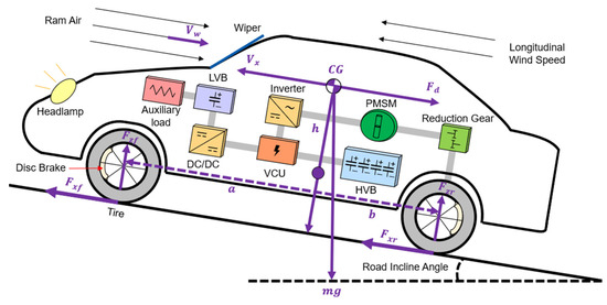 The HVB model consists of an HVB pack that stores electrical energy for the vehicle operation. To manage changes in specifications and configurations flexibly, mathematical modeling was performed based on a 2-RC equivalent circuit, as shown in Figure 2 [31]. Detailed specifications of the HVB model are listed in Table 1.