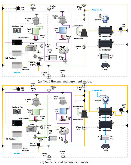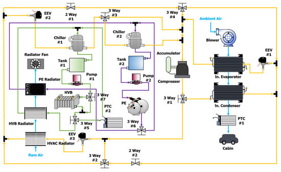 The proposed heat-pump-based ITMS for managing the operating temperatures of the HVB and PE modules as well as for cabin heating and cooling is depicted in Figure 4. The highlighted orange lines represent the HVAC circuit, green lines correspond to the thermal management circuit for the HVB, and purple lines indicate the thermal management circuit for the PE module.