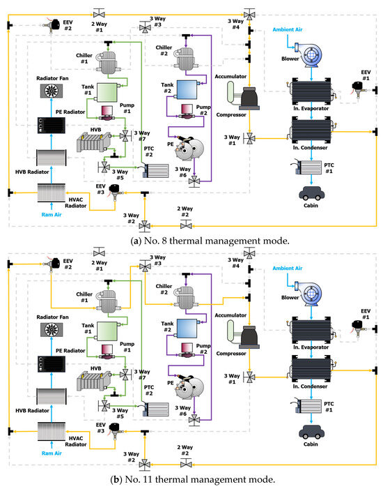 The 8th and 11th thermal management modes are designed to perform thermal management, as shown in Figure 7, when the vehicle is driven under conditions in which the indoor set and HVB operating temperatures are below the normal range. The eighth thermal management mode is operated when the operating temperature of the HVB is either below the maximum allowable operating temperature or at the minimum allowable operating temperature and under conditions lower than the maximum allowable operating temperature. When the ITMS operates in the eighth thermal management mode, the high-temperature and high-pressure refrigerant discharged from the compressor undergoes condensation by releasing heat into the air, which is transferred to the cabin through the cabin-side condenser. The condensed refrigerant then passes through EEV #3, installed at the entrance of the HVAC-side radiator, reaching a low-temperature and low-pressure state. After absorbing heat from the outdoor air in the HVAC-side radiator, the refrigerant returns to the compressor. In summary, the eighth thermal management mode utilizes outdoor air as a heat source to provide cabin heating. Conversely, the 11th thermal management mode operates when the operating temperature of the HVB reaches the maximum allowable operating temperature and under conditions higher than the minimum allowable operating temperature. When the ITMS is operated in the 11th thermal management mode, the high-temperature and high-pressure refrigerant discharged from the compressor undergoes condensation by releasing heat to the air that is transferred to the cabin through the cabin-side condenser. After absorbing heat from the outdoor air in the HVAC-side radiator and waste heat from the HVB and PE through chillers #1 and #2, respectively, the refrigerant returns to the compressor. In summary, the 11th thermal management mode utilizes both outdoor air and waste heat from both the HVB and PE as heat sources for cabin heating.