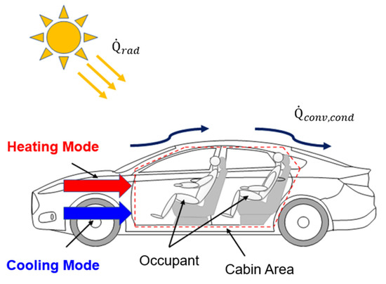 Since the Industrial Revolution up to the present day, the automotive industry has evolved, focusing on internal combustion engine vehicles powered by fossil fuels. In recent times, regulations on internal combustion engine vehicles have gradually expanded, as greenhouse gases generated through the combustion reactions in these vehicles are increasingly recognized as a major contributor to global warming. In response to these regulations, global automotive manufacturers have accelerated their research and development efforts toward environmentally friendly vehicles that do not emit greenhouse gases [1,2,3]. Among environmentally friendly vehicles, battery electric vehicles (BEVs) have gained considerable attention, constituting approximately 6.2% of the global automotive market, because of their high energy efficiency and convenient charging accessibility [4,5]. However, the commercial adoption of BEVs is limited owing to technical issues, such as a reduced driving range during winter, which is attributed to rapid power consumption for cabin heating [6,7]. The thermal management system of BEVs is identified as the primary cause of reduced driving range.