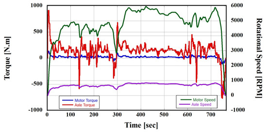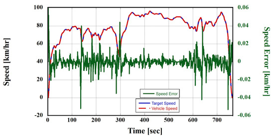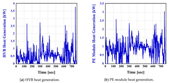 Before evaluating the proposed ITMS, it is essential to conduct a preliminary assessment of the thermal load inputted into the ITMS to ensure the reliability of the thermal load. The powertrain system model undergoes energy storage, discharge, and conversion processes between the HVB and PE modules for driving. The energy losses act as thermal loads. To generate thermal loads, the BEV tracked the speed profile, as shown in Figure 9. The maximum error owing to speed estimation was 0.05 km/h, indicating a low error rate of less than 0.0005% relative error [38,39,40]. Furthermore, the torque and rotational speeds of the PMSM and axle were generated to track the speed profile, as shown in Figure 10. Consequently, as the powertrain system model tracked the speed profile, thermal loads were generated in the HVB and PE modules, as illustrated in Figure 11.