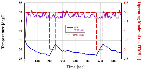 - In this study, the designed and modeled heat-pump-system-based ITMS was evaluated under high-load conditions, specifically the HWFET driving cycle. It demonstrated stable thermal control for the cabin, HVB, and PE module, effectively adapting to both high-temperature conditions with an outside air temperature of 36 °C and low-temperature conditions with an outside air temperature of −10 °C.