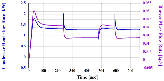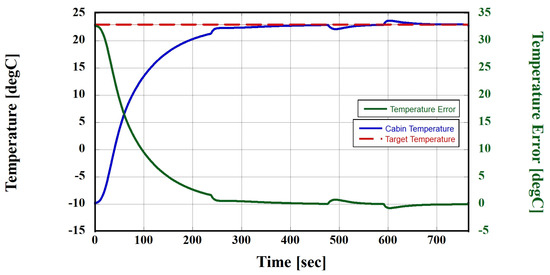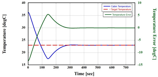 In this section, the designed ITMS was evaluated to assess its ability to cope with high-temperature conditions using the third and fifth thermal management modes. Thermal management modes are generally switched based on the ambient, cabin, and HVB operating temperatures. However, in this section, the simulations were assumed to be conducted under high-temperature conditions. Therefore, the transition was considered based on the operating temperature of the HVB. In other words, both the third and fifth thermal management modes inherently perform cooling of the cabin, and, in the fifth mode, cooling of the HVB is performed, leading to an increased cooling load. Under high-temperature conditions, the initial operating temperature of the HVB and PE module was 36 °C, as shown in Figure 12, which was the same as the ambient temperature. Therefore, the relatively high operating temperature of the PE module can be cooled through ambient air; however, to cool the HVB, which has a lower set temperature than the ambient air, the simulation must initially operate in the fifth thermal management mode, as depicted in Figure 12. The fifth thermal management mode, as illustrated in Figure 13, cools the HVB coolant through chiller #1 and transfers the cooled coolant to the HVB cooling circuit to perform the thermal management of the HVB under high-temperature conditions. In addition, the ITMS should be capable of cooling cabins. The cabin temperature starts at the same 36 °C as the ambient temperature. For cabin cooling, as shown in Figure 14, the air flowing through the blower is cooled through the evaporator. In this process, to facilitate effective heat transfer in the evaporator, EEV #1, depicted in Figure 15, was used to expand the refrigerant. Consequently, the cabin temperature reaches the target value, as shown in Figure 16. Furthermore, to repeat the cooling cycle introduced earlier, the heat absorbed by the refrigerant in chiller #1 and the evaporator acted as a load on the HVAC system under high-temperature conditions. The heat was then discharged from the HVAC-side radiator, as illustrated in Figure 17, after being drawn into the compressor and expelled at a high temperature and pressure.