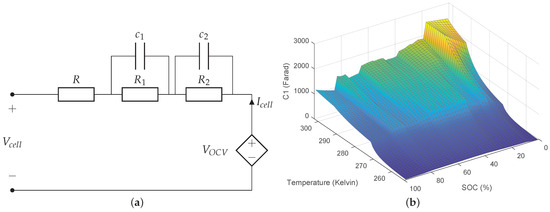 where denotes the terminal cell voltage, is the open circuit voltage, cell current, R, and are resistances, and are polarization voltages over the RC tanks and and are capacitors. All magnitudes in this paper are expressed in SI units unless noted otherwise. The model parameters , , , , R and are dependent on the current direction (i.e., charging or discharging), cell temperature and State of Charge (SoC). An example of the dependency of one of these parameters on SoC and temperature is found in Figure 1b. All the other parameter dependencies are found in the previous version of this work [11].