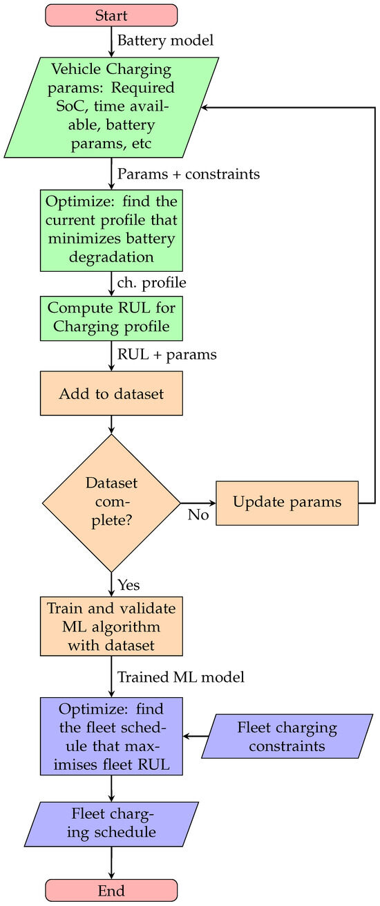 The method is composed of three key elements: an optimization algorithm for creating a charging profile for a single vehicle; an ML model to predict the battery RUL when the charging profile is used; an optimization algorithm to schedule the charging moments of an entire fleet. The charging profile optimization is based on a modelling strategy that captures the battery dynamics and battery degradation. Such an optimization maximizes the RUL of an individual vehicle. Based on the resulting charging profile, an ML model was created to predict the battery RUL. Such an ML algorithm uses Gaussian Process Regression and is fed by repeatedly applying the optimal charging profiles of the previous step, while considering multiple values in the battery ageing parameters to account for its internal variability. Using the output of such a ML model, the second optimization calculates the charging order, while maximizing the total RUL of the fleet and taking into account common timing requirements of the fleet operator.
