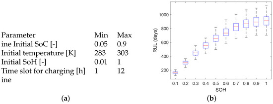 Variation in RUL and input parameters. (a) Minimum and maximum value between which the data is randomized. (b) RUL variance due to the internal variability. Initial SoC = 0.1, initial battery temperature = 12, time slot length = 8 h.
