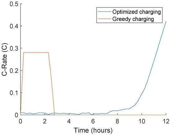 The greedy charging scenario charges the vehicle as soon as it arrives. The optimized charging charges as late as possible. This is because charging late reduces the average and RMS voltage in Equations (4) and (5). Reducing these voltages leads to less degradation. Likewise, the optimized charging scheme shows higher charging currents than the greedy scenario, at the last moments of charging, which leads to an overall lower RMS voltage, leading to lower degradation, even though C-rate is higher. This is a model-dependent effect, which might be different from other models from the literature. The RUL of the greedy scenario was 833 days, where the optimized scenario had a RUL of 1419 days, which is an increase of 71%. Notice that the greedy scenario was only created for reference, therefore it does not apply the highest possible charging current.