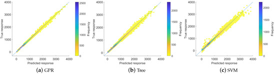 In Figure 5, the predictions of each trained algorithm can be found. As can be seen, the GPR has the lowest error margin, with predictions closer (and more frequent) to the actual value.