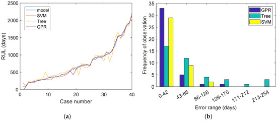 The three ML algorithms were also tested by creating new randomized inputs and comparing the predicted RUL of the ML model with the RUL of the model (expected value). These results can be found in Figure 6. In Figure 6a, the predicted RUL of each algorithm and the actual RUL can be seen, these values have been ordered based on the RUL. In Figure 6b the absolute error in the prediction can be seen. Both figures show that GPR has on average the lowest error in predicting the RUL. In Figure 6b, the frequency of each error range can be observed. As can be seen, the Tree algorithm performs poorly, as it has a some very large outliers in the error of its prediction. SVM predicts more accurately than Tree, but GPR has the most points in the lowest error range of 0–42 days. Using a GPR model to predict the RUL is 2000 times faster than the recurrently running the ageing model and the optimization algorithm created in Section 5.