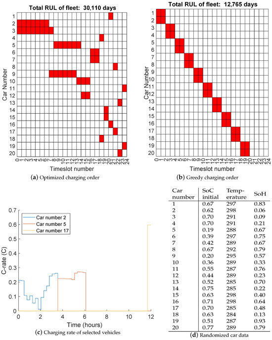 With these inputs, a set of optimal charging schemes and corresponding RUL was calculated. Each parameter is randomized between the maximum and minimum value as shown in Figure 3a. Note that the constraint that each vehicle is charged to at least a SoC of 97% as shown in Equation (12), is implicit in the RUL prediction of the ML model.