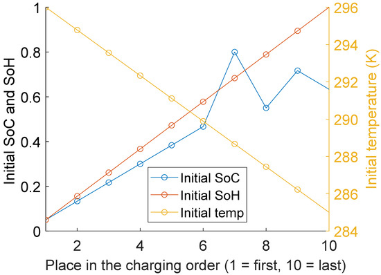 For the initial temperature the relationship is linear: first the vehicle with the highest initial temperature is charged and later the vehicles with a lower initial temperatures. Recall from Equation (4) that higher temperatures result in higher capacity loss due to calendar ageing (i.e., a shorter RUL). Likewise, a battery with a higher temperature cools down faster because the difference with the ambient temperature (which is assumed to be constant at 283 °K) is higher. Therefore, from a fleet perspective, it is preferable to charge the warmest battery first, as it cools down faster (than a colder battery) resulting in the least amount of total fleet degradation.