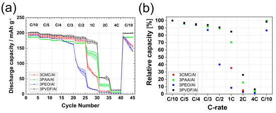 (a) Discharge capacity vs. cycle number; (b) relative capacity vs. C rate of 3CMC/Al, 3PAA/Al, 3PEO/Al, and 3PVDF/Al electrodes.
