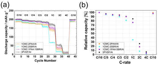 The capacities of the 1CMC:2SBR/Al and 1CMC:2PAA/Al electrodes almost overlapped from C/5 to C/3, while at C/2, 1CMC:2PAA/Al performed better, with a capacity of 169 mAh g−1 instead of 158 mAh g−1 for 1CMC:2SBR/Al. At 1C, the 1CMC:2SBR/Al electrodes performed the worst, yielding a capacity of only 70 mAh g−1, while 1CMC:2PAA/Al and 1CMC:1PAA:1SBR/Al electrodes yielded around 140–150 mAh g−1. The relative capacity of 3PVDF/Al was about 9% higher at this rate in comparison to 1CMC:2PAA/Al or 1CMC:1PAA:1SBR/Al, i.e., 85% for 3PVDF/Al vs. 76% for 1CMC:2PAA/Al and 1CMC:1PAA:1SBR/Al.