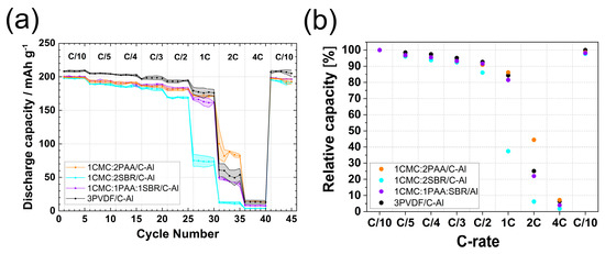 (a) Discharge capacity vs. cycle number; (b) relative capacity vs. C rate of 1CMC:2PAA/Al, 1CMC:2SBR/Al, 1CMC:1PAA:1SBR/Al, and 3PVDF/Al electrodes.