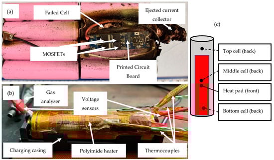 All testing was carried out in an abuse test chamber set at 25 °C, with temperatures monitored using K-type thermocouples (TCs) connected to a Pico (TC-08) data logger. The cell voltage was monitored using a voltage sensor (TC-08 single channel terminal board). Cell charging and characterisation was carried out using a Maccor 4200 battery cycler. Localised heating was provided using an Omega polyimide flexible film heater (12.7 mm wide × 50.8 mm long and rated at 10 W). The heating temperature was further controlled using a proportional integral derivative (PID) controller based on an Arduino board. The controller regulated the supplied current to the heater so that the programmed temperatures were 100 °C, 150 °C, 200 °C and 250 °C. Figure 1 shows a module failure situation from an internal case study using similar cells and an experimental setup to emulate a failure situation.