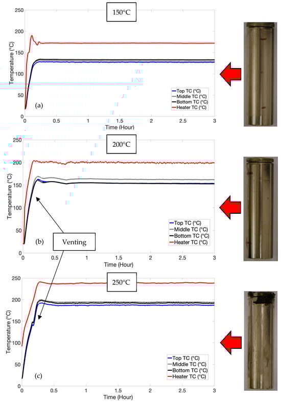 Figure 2. Temperature plots and images after testing for low-SOC test. Typical plots and images are shown after the test for 150 °C (a), 200 °C (b) and 250 °C (c).