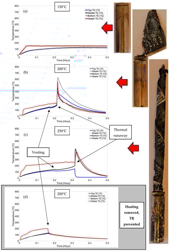 A definitive time lag was observed between the venting event and the thermal runaway events, suggesting that additional heat was required to induce TR. To explore the possibility that removing the heat source from the cell would eliminate the resulting TR, the test was repeated at 200 °C with heat removed from the cell once venting had occurred. This is shown in Figure 3d. This had important ramifications in that by removing the heat source (or quenching) following venting, TR can be prevented, provided that self-heating has not started.