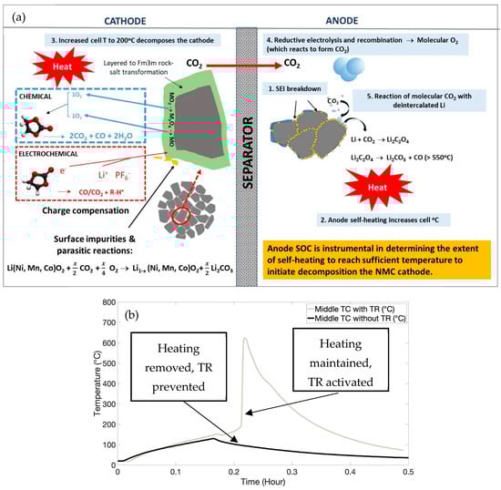 Figure 5. (a) Decomposition cascade highlighting co-dependent behaviours of anodes and cathodes during cell heating; (b) temperature plots for cells with high SOC and 200 °C with and without TR activation.