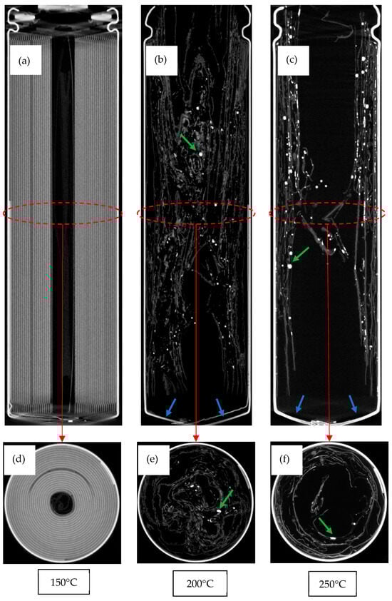 Figure 6. Tomograms of cells after testing. Longitudinal scans shown in (ac). Axial scans shown in (df). Blue arrows show bulging, and green arrows show examples of melted copper.