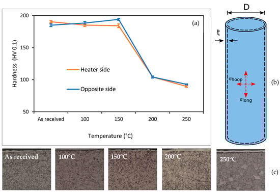 The mechanical degradation of the cell can after the high-SOC test was evaluated using hardness testing. The testing was carried out on the can at the middle of the heater, with five indents taken at the front and the back of the cell. The hardness values were averaged at these locations and compared for the various temperatures applied in the cell heating test. Figure 7 shows the results of these tests. The thermal profiles solely applied using the heater did not change the mechanical properties of the can. Rather, it was the thermal runaway event that changed its hardness; the can became softer. Hardness testing is directly proportional to the yield strength of a material [51].