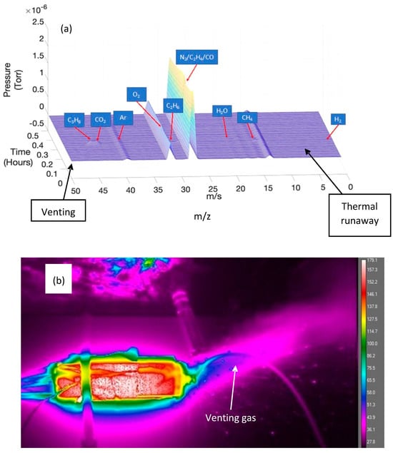 Figure 8. Results from gas analysis. (a) shows GC–MS spectra for high-SOC test at 200 °C, and (b) shows thermographic image taken during venting.