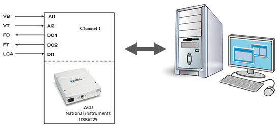 An initial specification was designed for the software to control the charging/discharging system through the ACU. The input and output lines of the ACU are shown in Figure 3, where VB is the Analog input line 1, the battery voltage; VT is the Analog input line 2, the battery temperature; FD is the Digital output line 1, end of the discharging step; FT is the Digital output line 2, end of the test; LCA is the Digital input line 1, and the command for reading the open battery voltage.