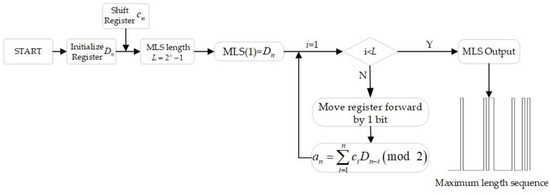 In Figure 1, represents the states of the n shift registers at a given moment, denotes the feedback coefficients of the shift register, and L is the total length of the sequence. The first bit of the MLS is the n-th bit of the initialization register; next, the adder uses the addition of Module 2.