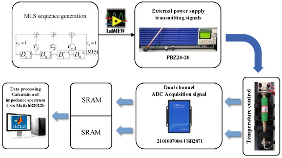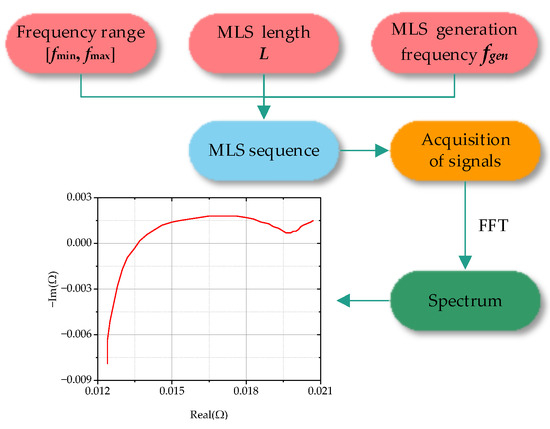 During testing a battery’s impedance, it is necessary to set the parameters fgen and generate the MLS sequence offline according to the measurement bandwidth [fmin, fmax] for the battery to be tested. Afterward, the MLS sequence is injected into the lithium-ion battery as an excitation, and the battery’s impedance in the whole frequency domain is calculated by collecting the voltage and current measurements. Thus, a spectral curve of the impedance is obtained. The whole process is shown in Figure 2.