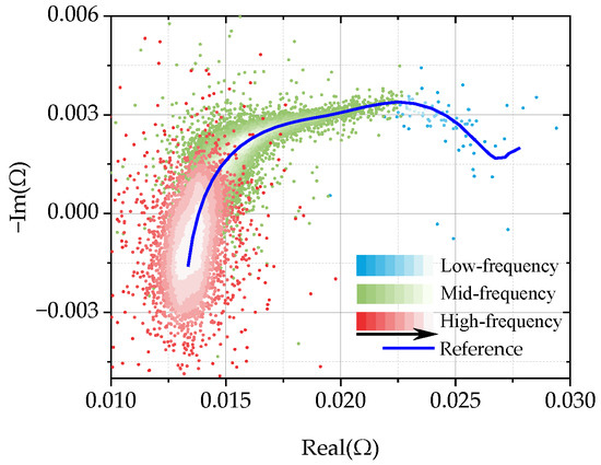 The EIS measurement relies on a small perturbation signal. In [28], it was found that the amplitude of the excitation signal should be less than 1 C without destroying the equilibrium state of the cell, and greater than 0.4 C to ensure a sufficient signal-to-noise ratio. In this study, the amplitude was chosen to be 0.8 C. To enable a convenient battery EIS measurement in a real application, this work used the PRBS excitation signal instead of the traditional single sine sweeping injection. Since the amplitude of the PRBS was limited, the decomposition of the PRBS’s amplitude at each frequency point was even smaller compared with the sine sweeping method. In addition, the aggregated carrier class excitation method has a disadvantage in power density. The original impedance spectra of the battery calculated directly from the voltage and current responses under PRBS is shown in Figure 3. The direction of the arrow in the legend of Figure 3 is where the data density is concentrated. The measurable impedance data are chaotically dispersed at each frequency point, which increased the difficulties in extracting the useful impedance accurately and made it difficult to form an effective EIS for the battery.