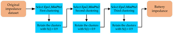 When processing a large-scale dataset, MinPts = 2·D (D is the dimension of the sample data) is usually set for DBSCAN. When the measurement data contain high noise, Minpts should be appropriately increased on the basis of 2·D. In this study, the MinPts was selected as 5 for clustering the battery’s impedance data. This was because the battery’s impedance contained two dimensions of real and imaginary parts with extensive noise.